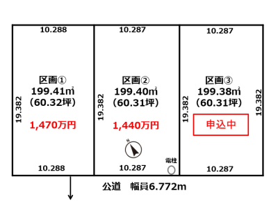- ①南西道路幅員6.772mに10.288m接する②③南西道路幅員6.772mに10.287m接する