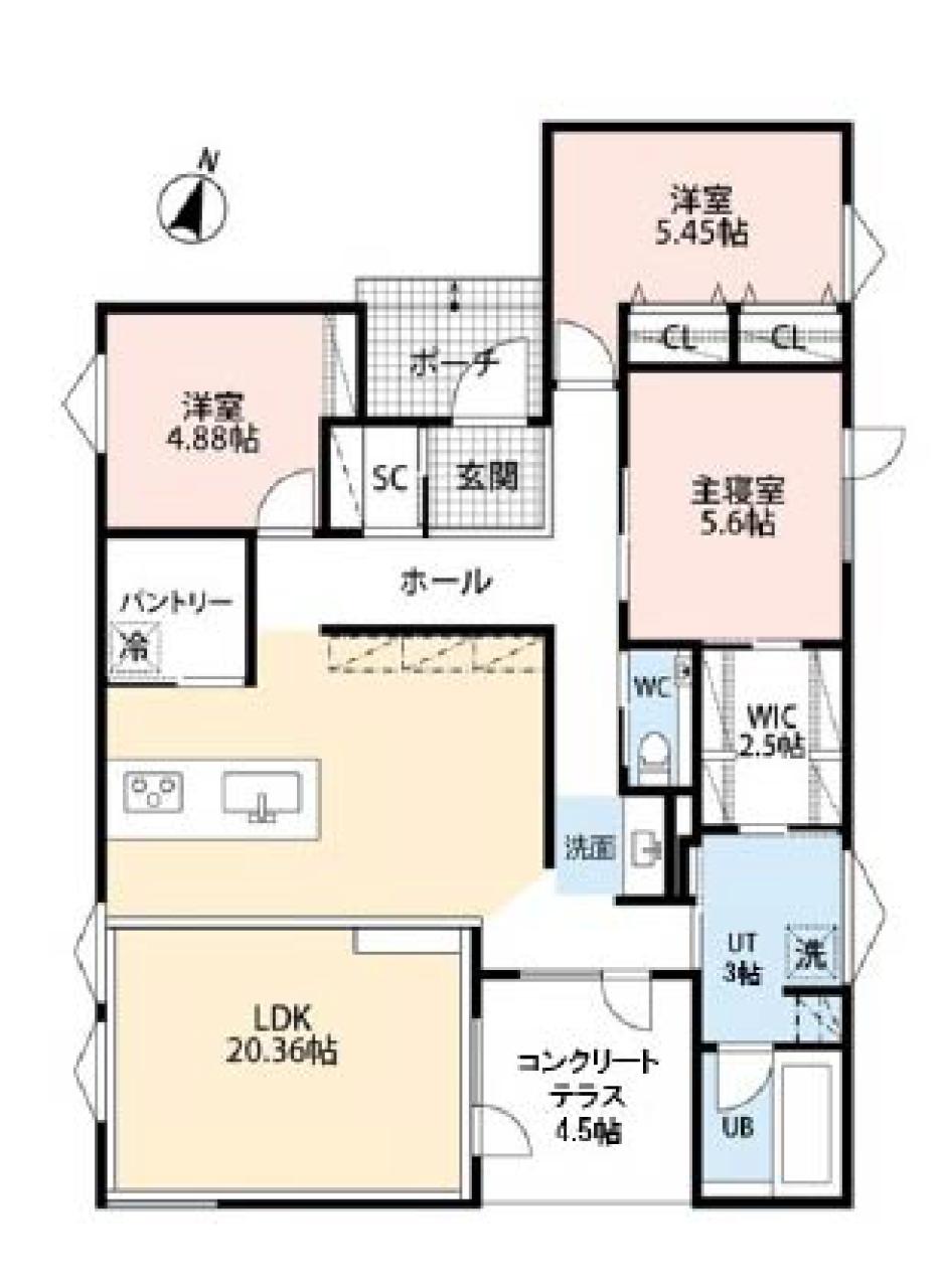 ■南向き3面採光のLDKは広々20.36帖、コンクリートテラス付き