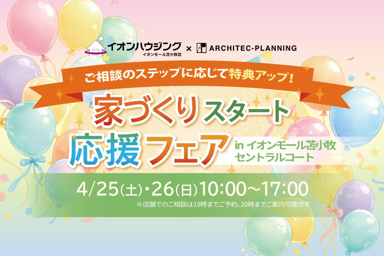 イオンハウジング イベント 家づくりスタート応援フェア 開催日 4/25(土)・4/26(日) 時 間 10:00~17:00 会 場 北海道苫小牧市柳町3丁目1−20 イオンモール苫小牧 1階 備 考 事前にHPもしくはお電話(0144-82-8277)からご予約くださいイオンハウジング苫小牧店はご予約不要で20時までご案内可能です 地図を印刷する 地図をアプリで見る 家づくりスタート応援フェア!ご好評につき、今月も開催決定!日時:4/25(土)・4/26(日)場所:イオンモール苫小牧 セントラルコート前回ご好評いただいた特典アップキャンペーンに加え、今回は会場を拡大し、お子さまに大人気の「ふわふわドーム」を設置いたします。ぜひご家族皆さまでご参加ください!また会場内では、モデルプランや価格をパネル展示にてご案内しております。スタッフにお声がけいただかなくても、ご自身のペースで自由にご覧いただけます。「家づくりを考え始めたいけど、何から始めたらいいかわからない」「小さなお子様がいるので、ゆっくり展示場に行くのが難しい」「まだ展示場見学までは考えていないけど、少し話を聞いてみたい」「自分たちのペースでゆっくり家づくりについての情報収集をしたい」イオンハウジング イオンモール苫小牧店は、イオンモール苫小牧内にあるため、お買い物ついでにお気軽にお立ち寄りいただけます。ご家族で楽しみながら、ご自身のペースで、家づくりの第一歩を踏み出してみませんか?▼家づくりスタート応援フェア特典STEP1:来場予約+アンケート記入+プラン依頼で2,000円分STEP2:プラン提案+次回面談で13,000円分STEP3:事前審査申込で15,000円分”最大30,000円分のイオン商品券”をプレゼント!※特典には条件がございます。詳しくはスタッフまでお問い合わせください。 一覧へ戻る