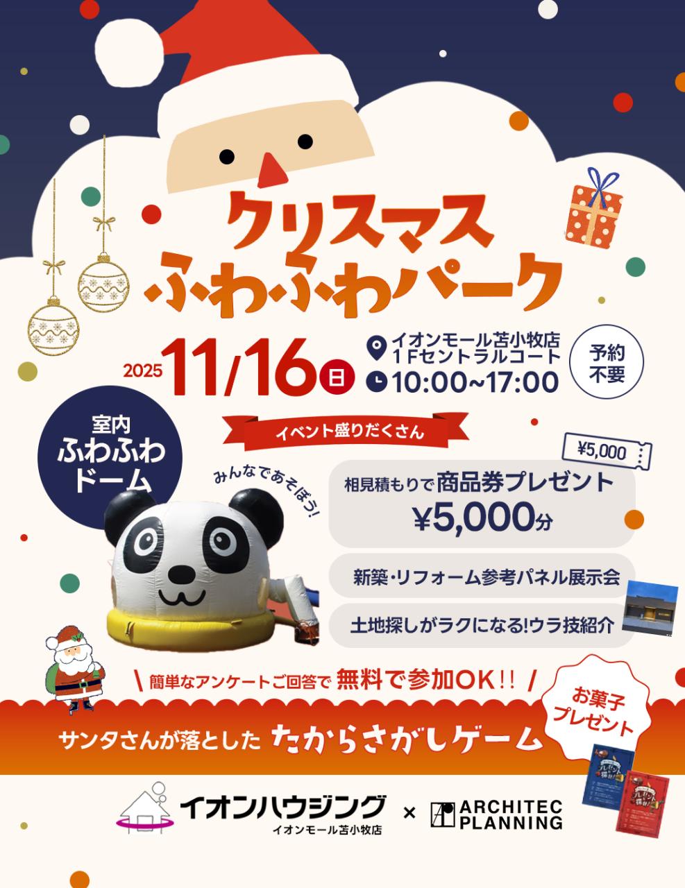 AEON HOUSINGイオンハウジング 2025.11.11 【イベント情報】11/16(日)イオンモール苫小牧店"クリスマスふわふわパーク"開催 1日限定!クリスマスふわふわパークイオンハウジング苫小牧店主催!イオンモール苫小牧店にて、『クリスマスふわふわパーク』イベントを開催いたします。週末のお出かけにぜひご家族でお越しくださいませ。 イベント詳細はこちら日程:2025年11月16日(日) 10:00-17:00場所:イオンモール苫小牧店1階セントラルコート北海道苫小牧市柳町3丁目1-20イオンモール苫小牧1F主催:イオンハウジング苫小牧店 ※ご予約不要、お気軽にご参加ください 盛りだくさん!イベント内容①ふわふわドーム無料!楽しいふわふわドームで遊びませんか?対象:小学生以下 ②サンタさんの落とし物~たからさがしクリスマス店舗内に隠されたサンタさんの落とし物を探しましょう!見つけた方にはお菓子をプレゼントいたします🎁対象:アンケートのご回答、instagramまたはLINEのフォローにて ③相見積もりで5,000円分商品券プレゼント!家づくりやリフォームをご検討の方で、すでに他社さんへ足を運ばれたことがある方へ。このイベントでお見積りをいただくと商品券をなんと¥5,000分プレゼントいたします! ④新築やリフォームの参考に!特大パネル展イメージしやすい!参考になる実例や人気の間取り・住宅スタイルを特大パネルでわかりやすくご紹介。 ⑤土地探し裏ワザ公開ご家族みんなの希望がマッチした良い土地がなかなか見つからない...…という方へ。特別にプロが使う『裏ワザ』を公開いたします! そのほかもイベント盛りだくさん。instagramフォロワーの方へのプレゼントもご用意しております。 ご予約は不要です!11/16(日)はぜひイオンハウジング/イオンモール苫小牧店にお越しくださいませ。ご来場心よりお待ちしております^^ PHOTO 一覧へ戻る