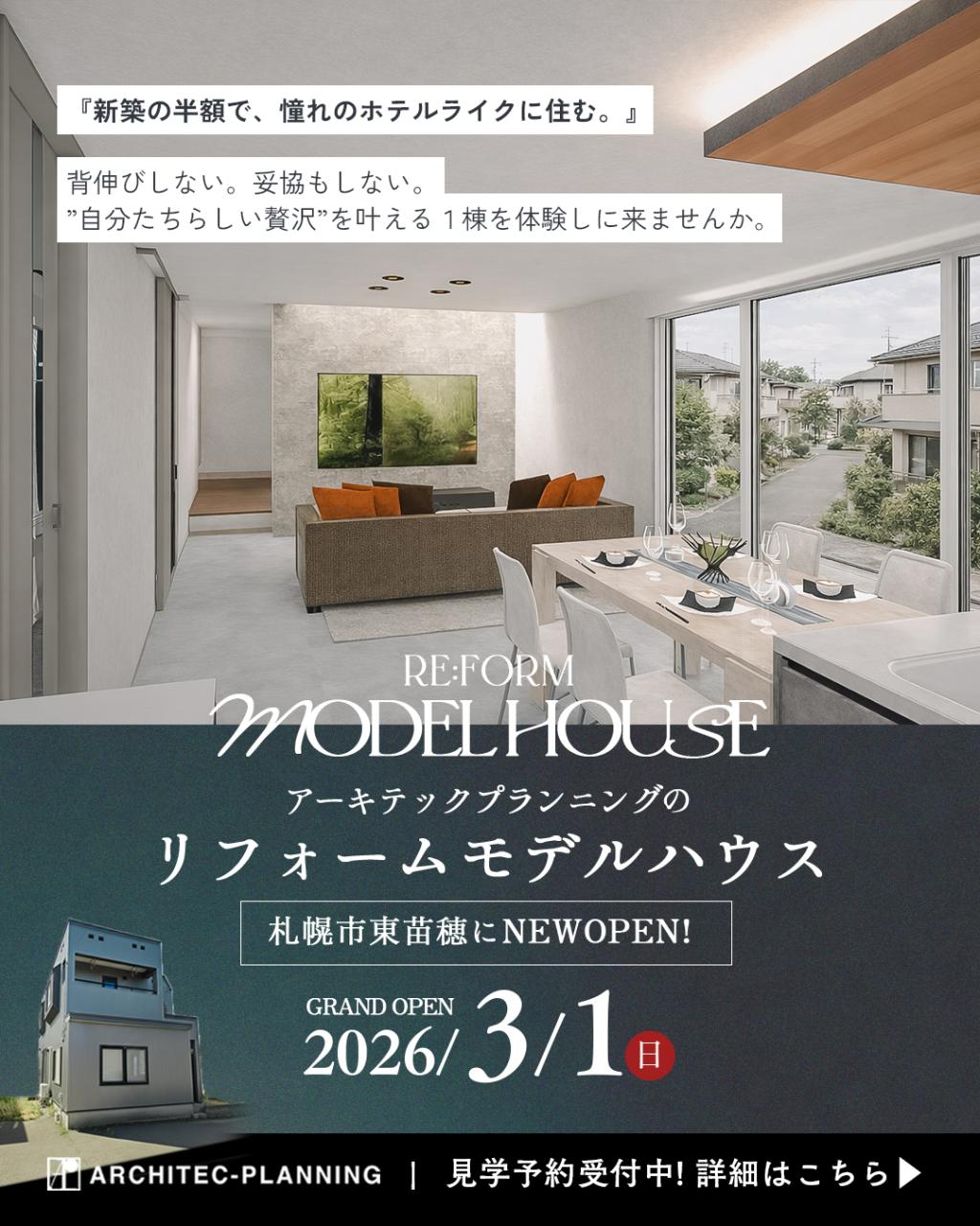 AEON HOUSINGイオンハウジング 2026.02.20 【3/15(日)OPEN】リフォームモデルハウス 東苗穂 【3/15(日) GRAND OPEN】札幌市東苗穂に、アーキテックプランニングのリフォームモデルハウスが初オープン。"新築の約半額"という驚きのコストで、憧れのホテルライクな暮らしを叶えませんか? 『リフォームモデルハウス東苗穂』📍札幌市東区東苗穂10条3丁目7-27※駐車場完備 ✓ 間取りから水回りの位置までフルリノベ✓ ストレートダイニング、玄関吹き抜け、間接照明など見どころ多数✓ ご購入検討はもちろん、中古リノベをお探しの方やご自宅リフォーム検討の方も大歓迎 「背伸びしない。妥協もしない。」賢い家族が選ぶ、リノベーションの完成形をぜひ体感してください。 ▽来場予約https://www.architec-net.jp/event/article.html?id=91464 ▽特設サイトhttps://www.architec-net.jp/lp-reform/ LINKリンクhttps://www.architec-net.jp/lp-reform/ PHOTO 一覧へ戻る