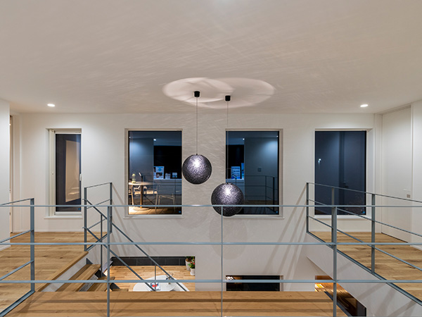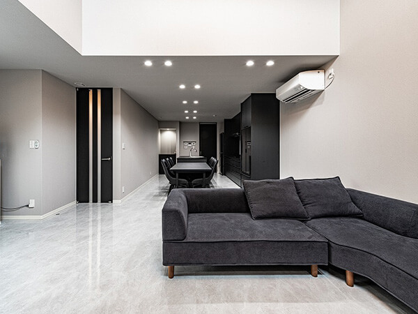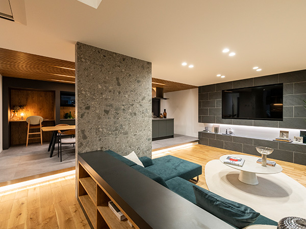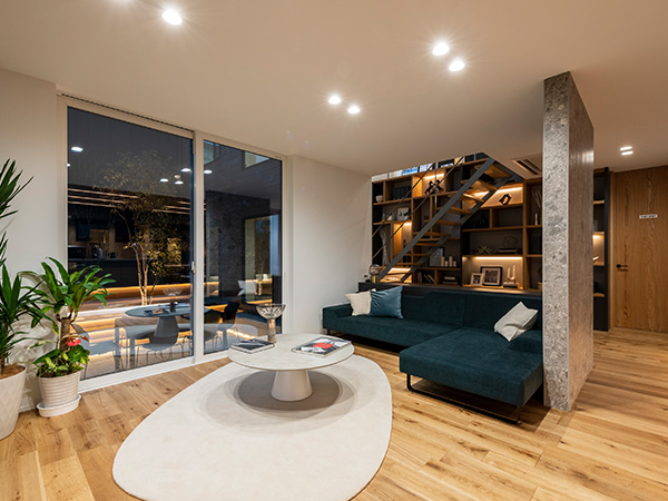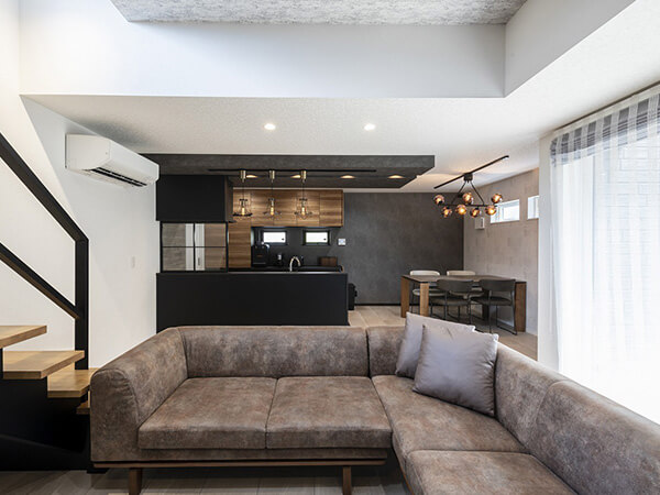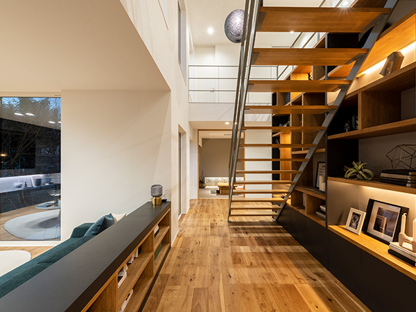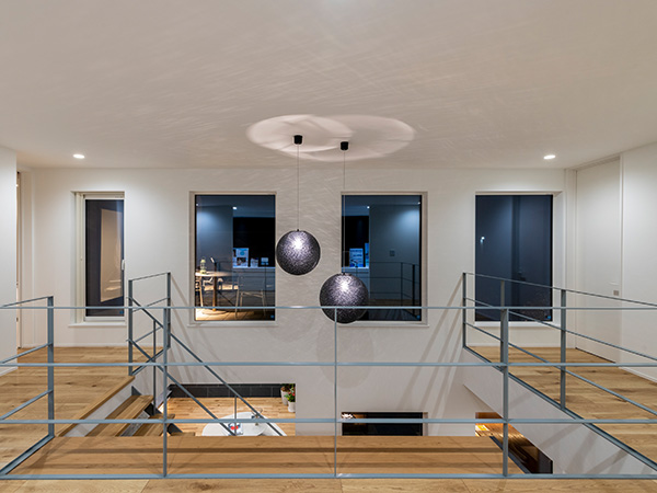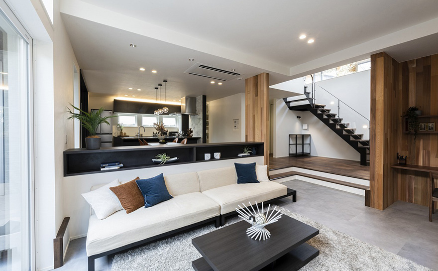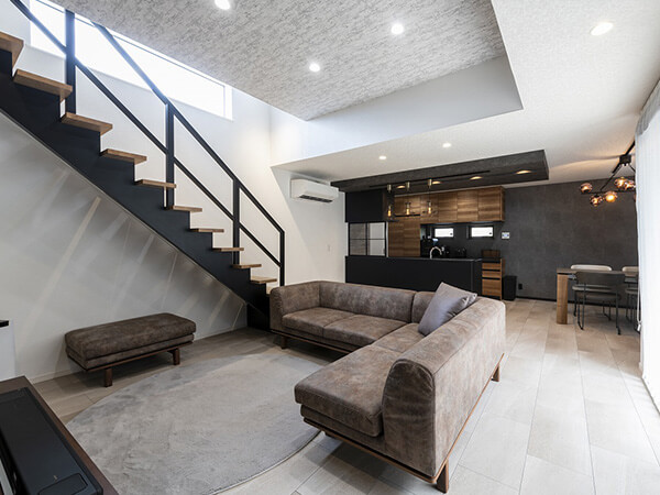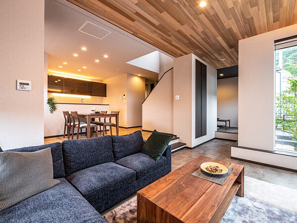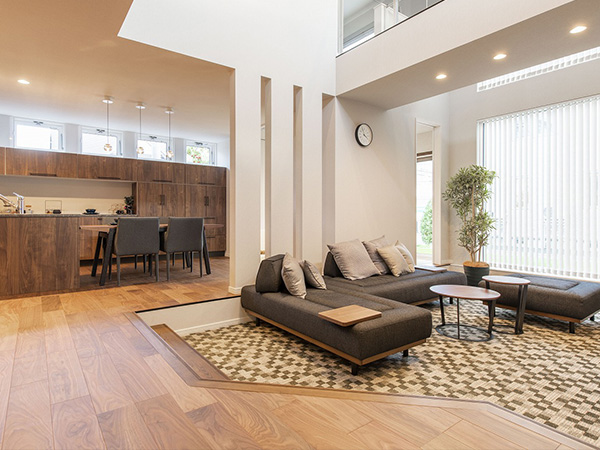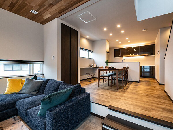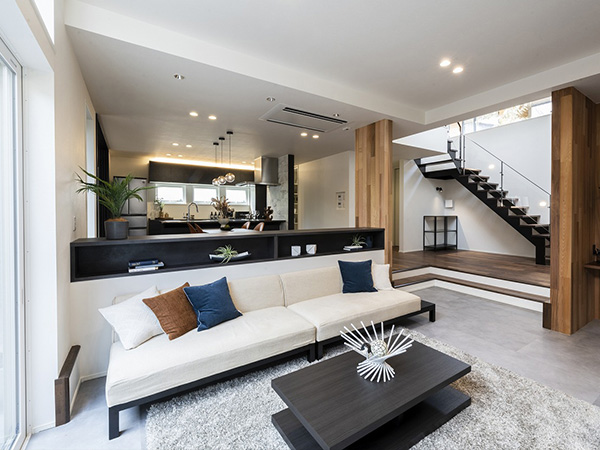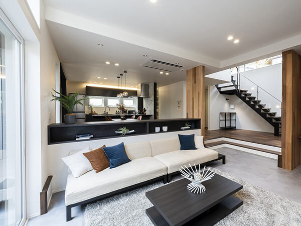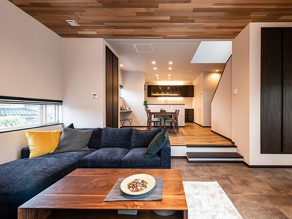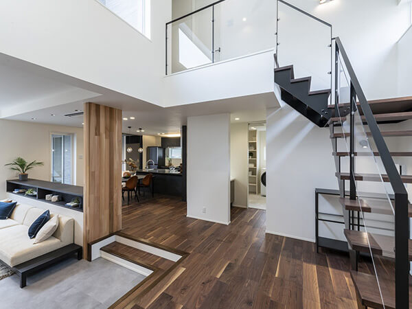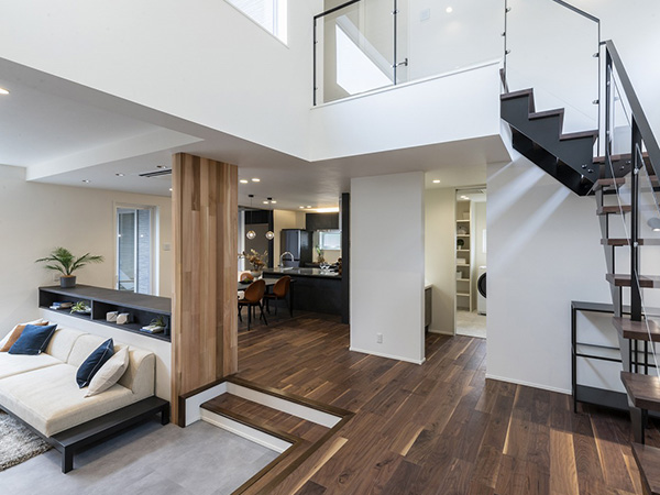 スキップフロアの開放的なリビングや