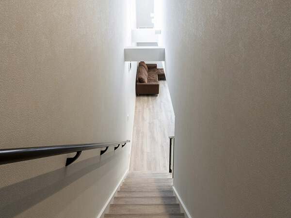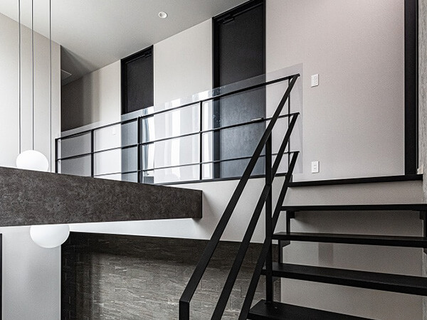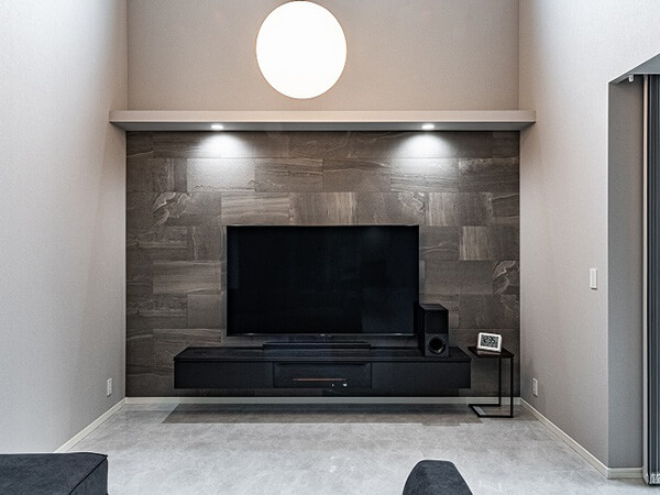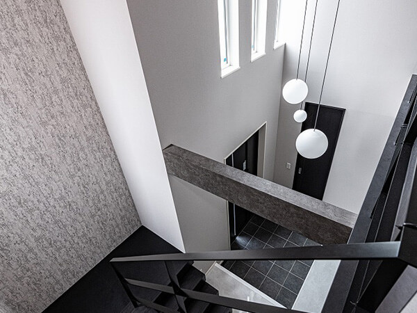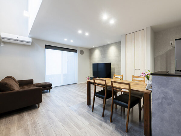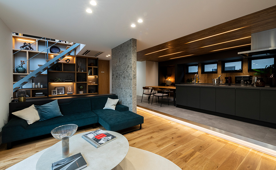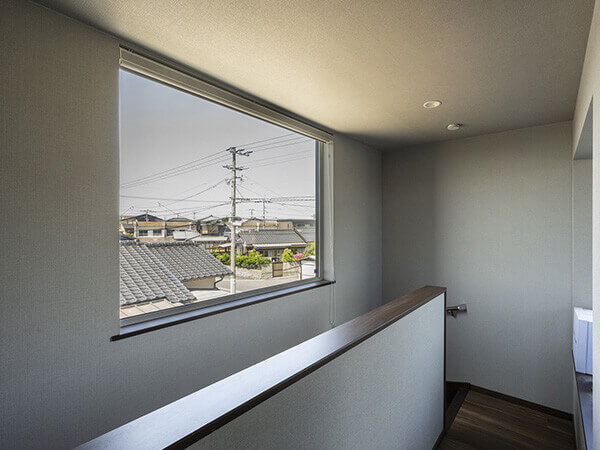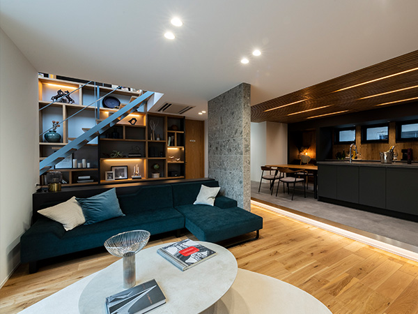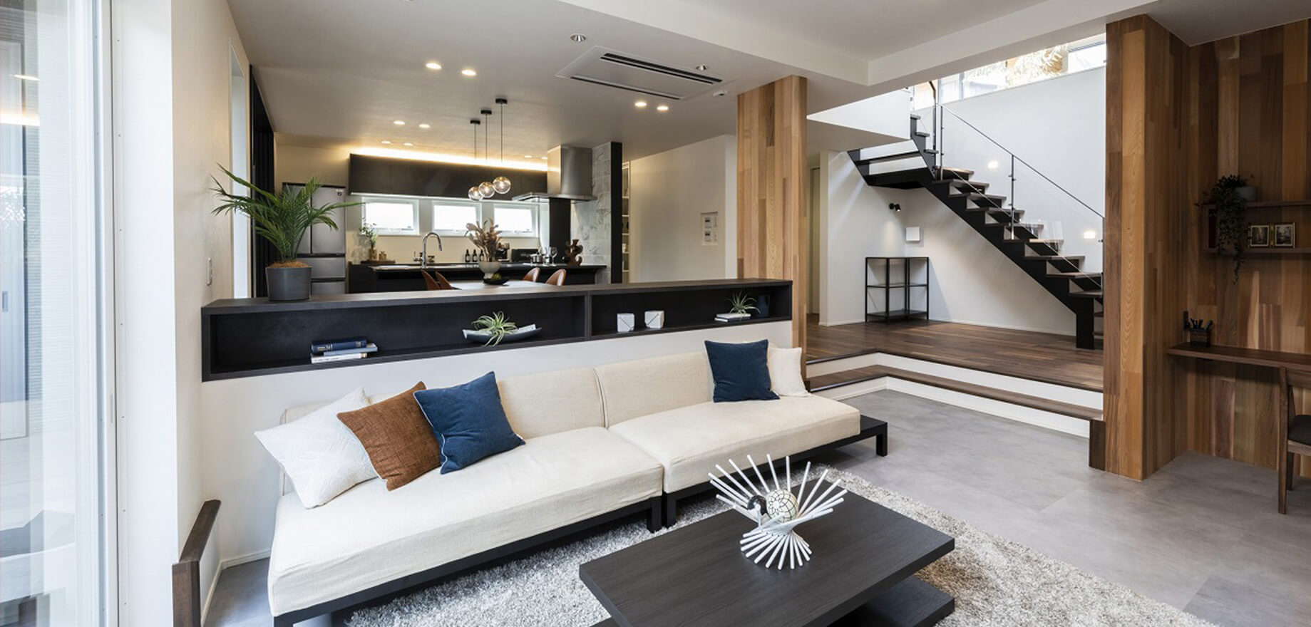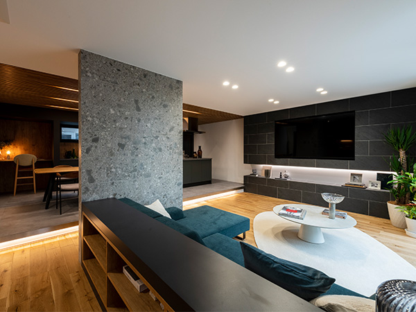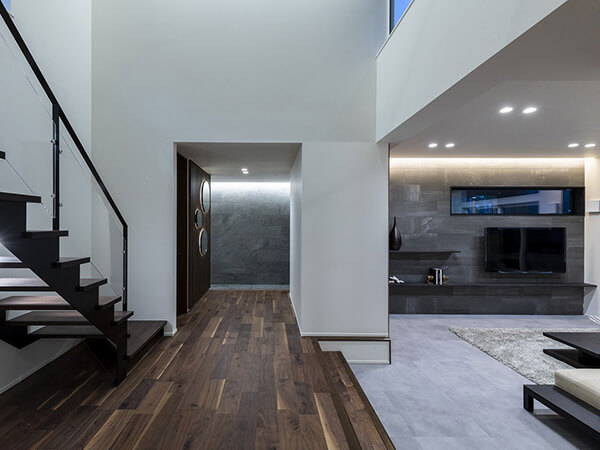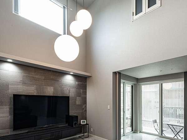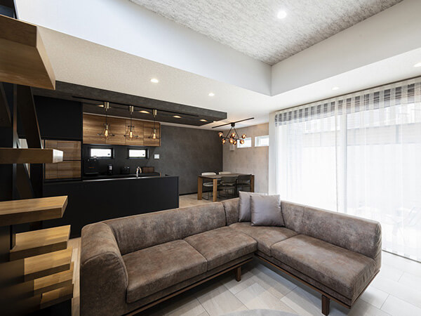 スキップフロアの開放的なリビングや
