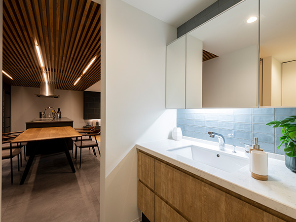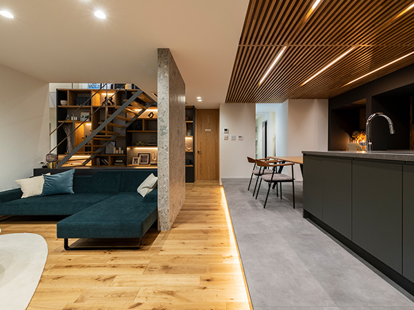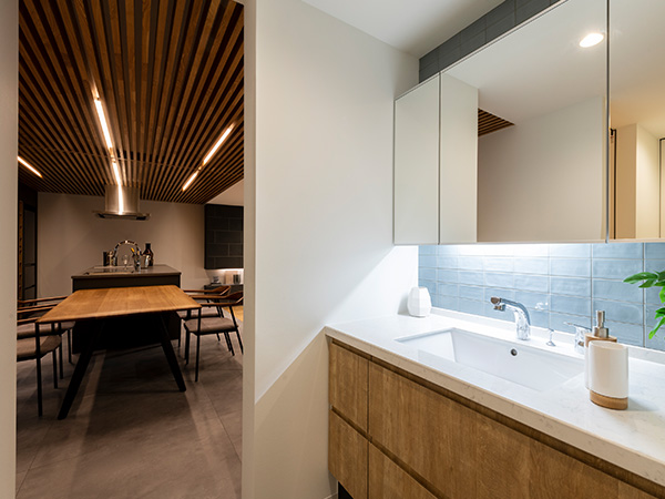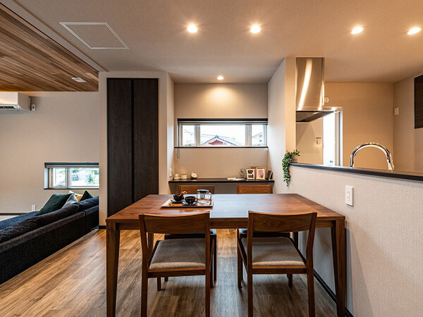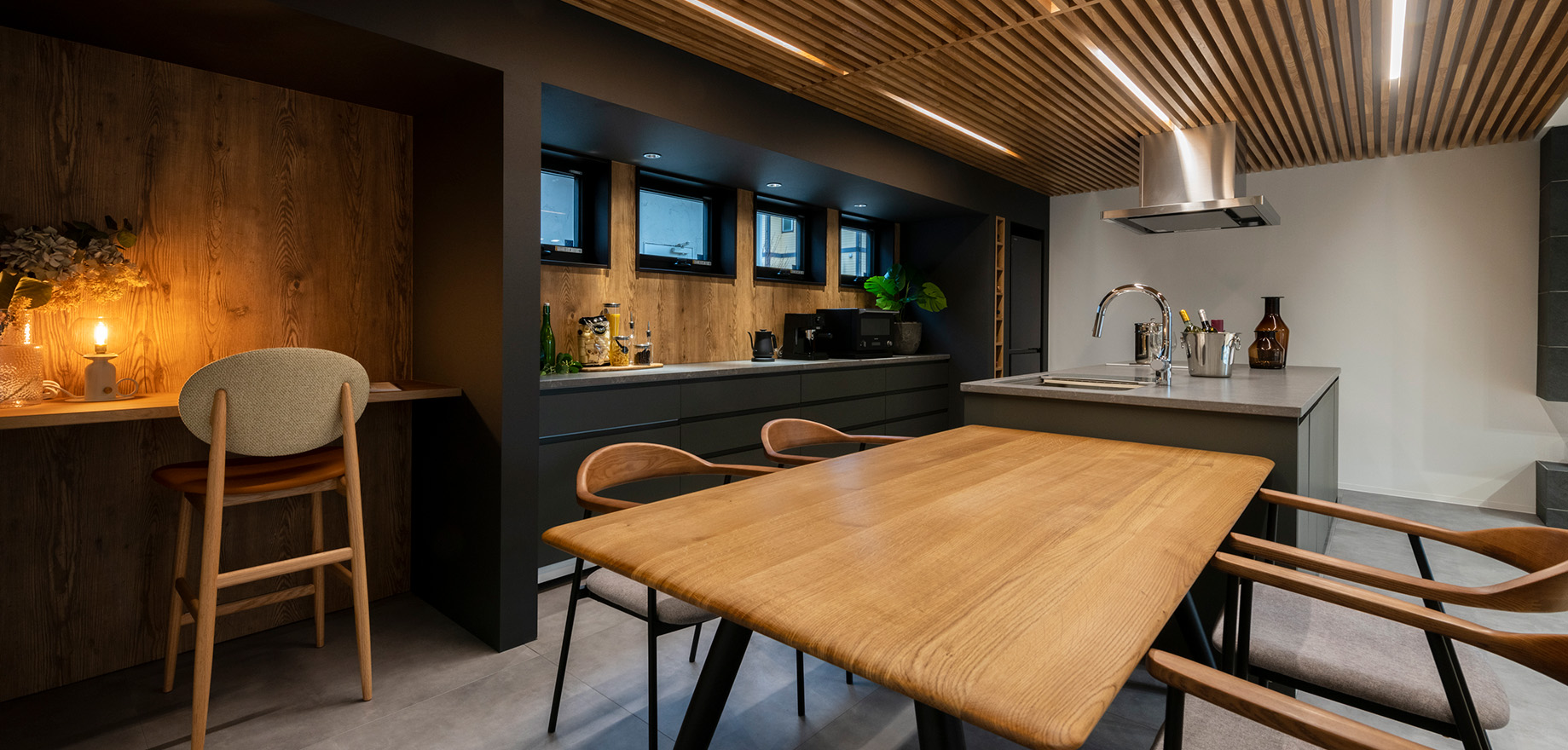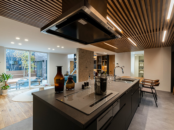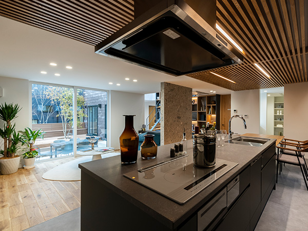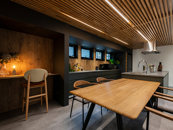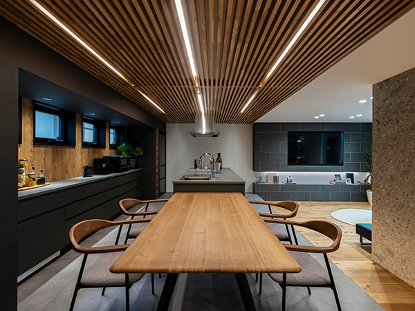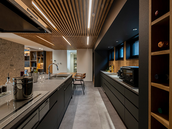 ルーバー天井が印象的なダイニングキッチン。