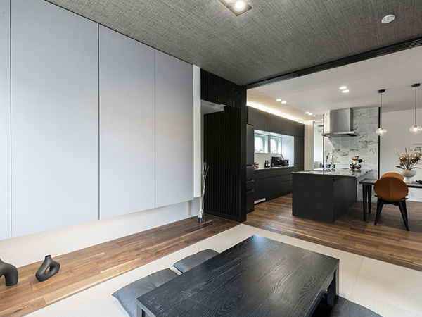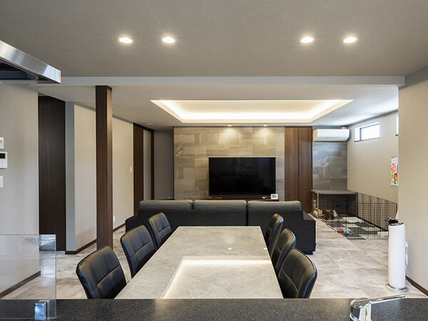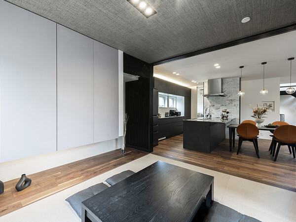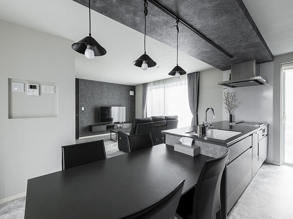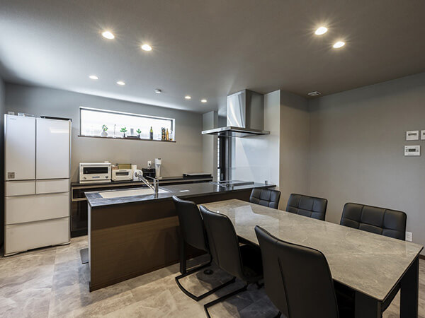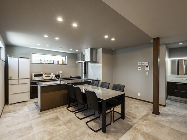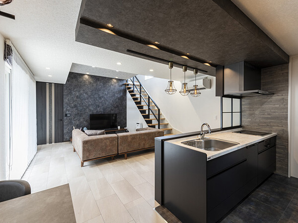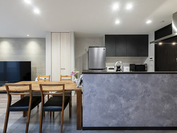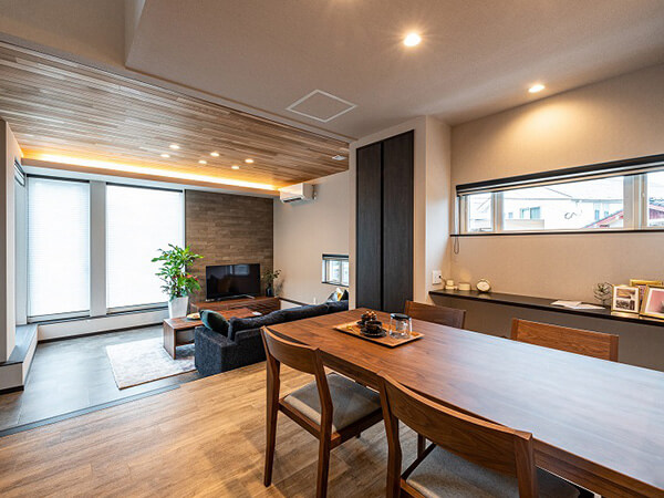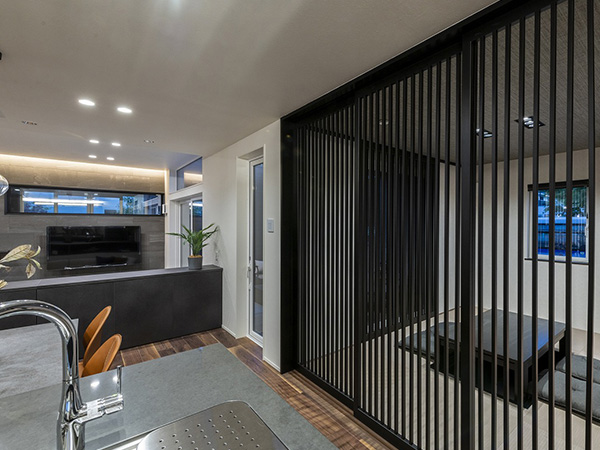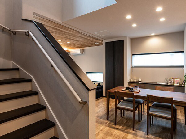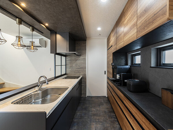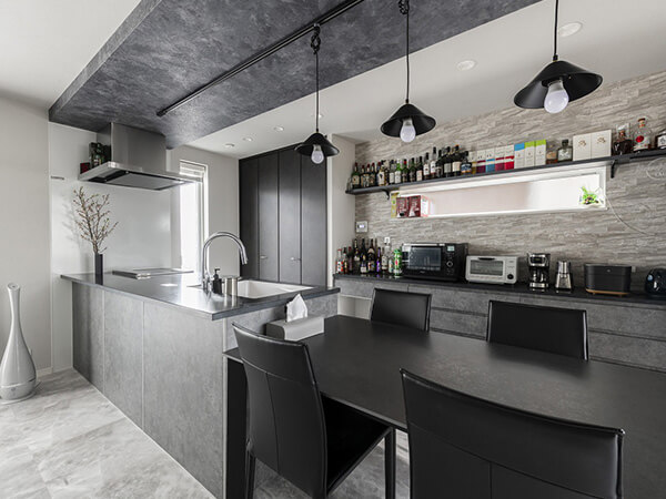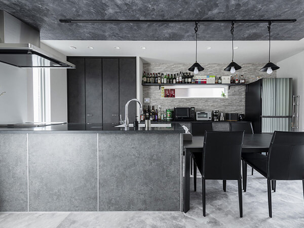 ルーバー天井が印象的なダイニングキッチン。