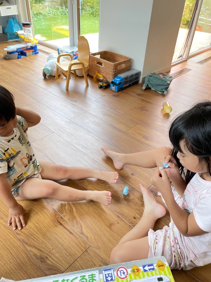 小1長女は自分の爪にマニキュア(子供用)を塗った後、末っ子の足にマニキュアを塗ってあげます。