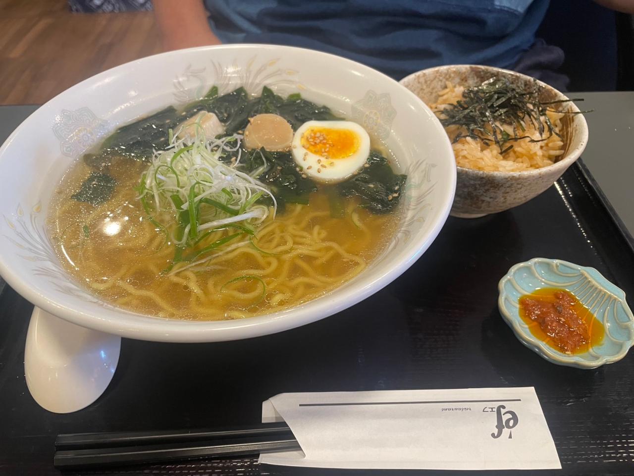 干貝柱塩ラーメンと、北見名物の塩焼きそばをシェア。