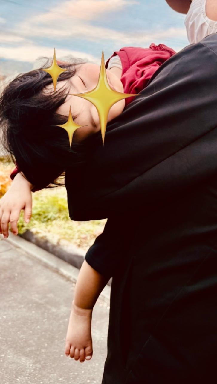 お迎えに行ったら疲れたのかアクロバティック爆睡してまして